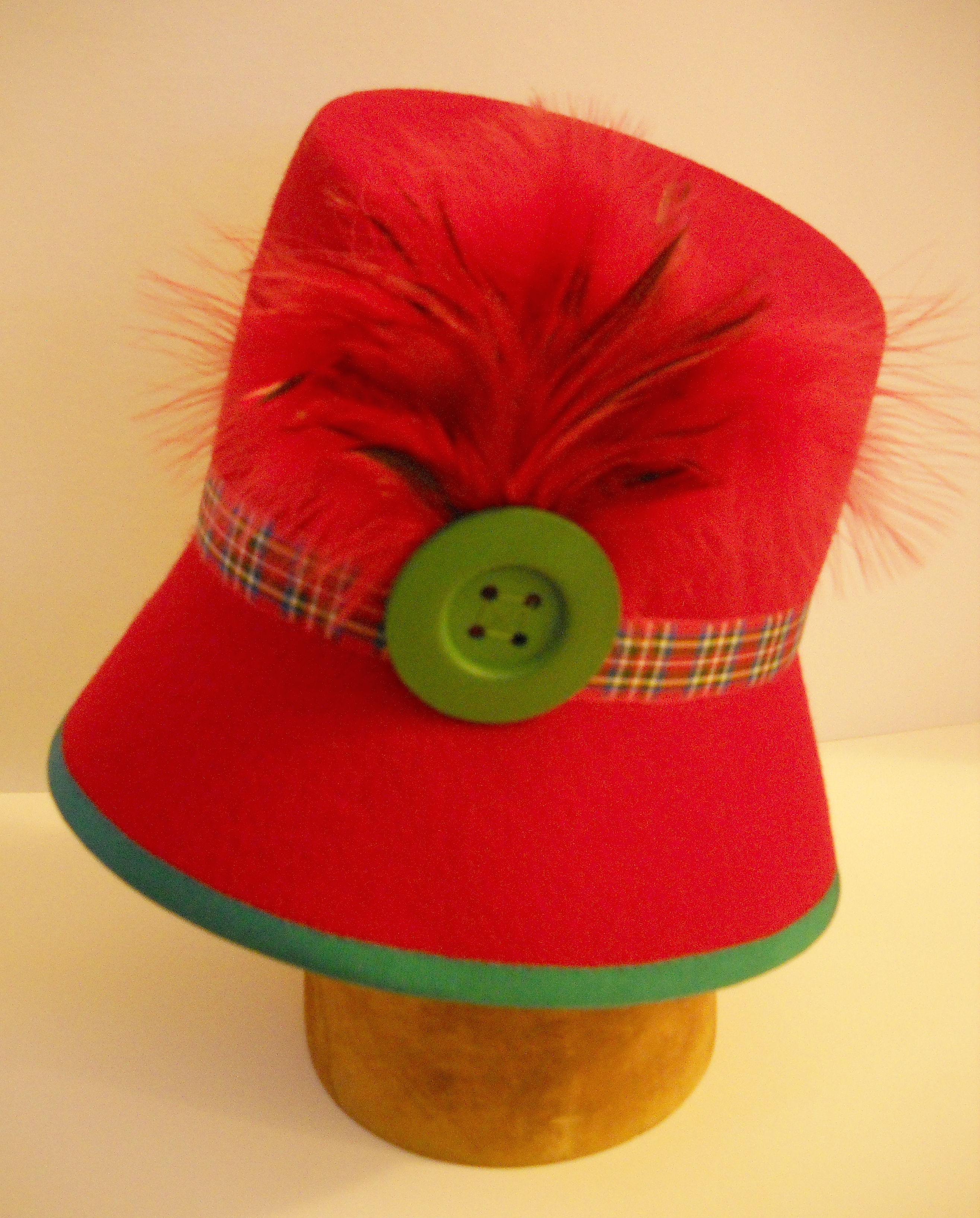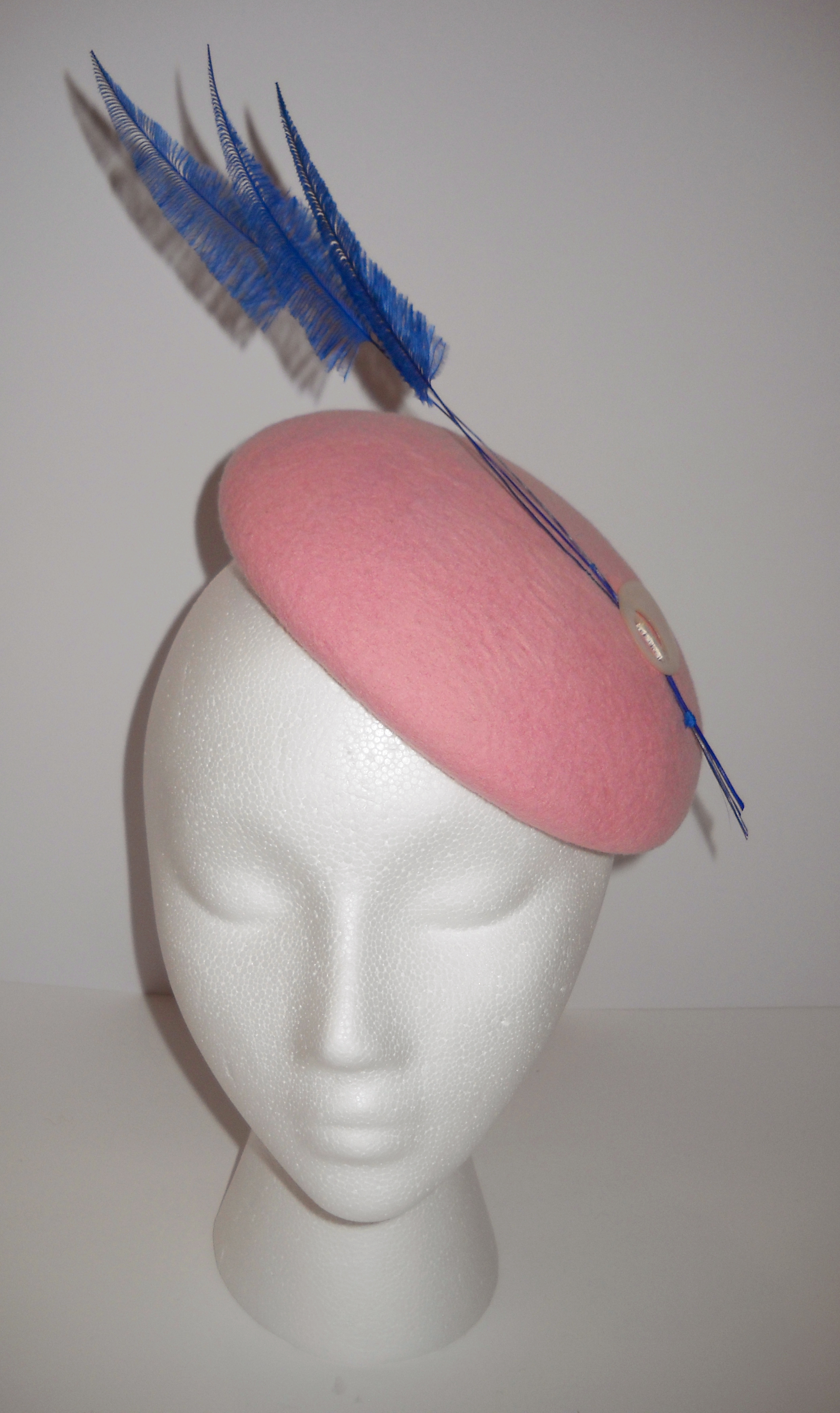 The above hat was made for a client to match an unusual bridal outfit. The bride had a clear picture of what she wanted and provided the ribbon and some of the feathers so that the hat would match her outfit perfectly.